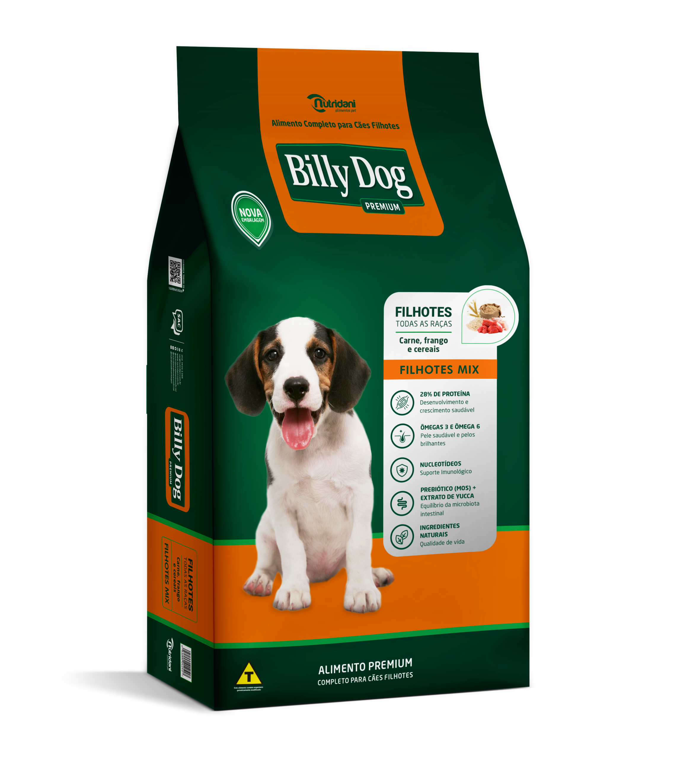 Com 28 % de proteínas, Billy Dog Filhotes Mix é um alimento completo para cães em crescimento. Sua composição é balanceada e contém os ingredientes essências e indispensáveis para o desenvolvimento corporal e cognitivo do filhote. Com 28% de Proteína garante uma boa manutenção dos músculos e tecidos. Contém Ômega 6 que reduz o colesterol (LDL) e triglicerídeos e mantém pelo e pele saudáveis.