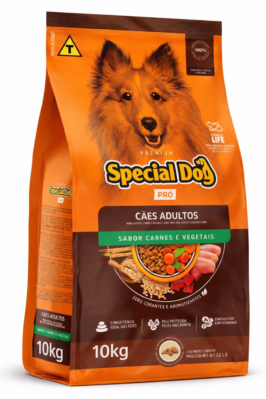 A ração Special Dog Vegetais Pró Adultos é um alimento da categoria Premium focado em oferecer um ideia equilibrada para cães acima de 1 ano de idade. Sua fórmula destaca-se por não conter corantes artificiais e ser enriquecida com vegetais desidratados, como cenoura e espinafre. Contém 23% de proteína de alta qualidade (Fator 23) para manutenção da massa muscular. A combinação de Ômegas 3 e 6 com zinco orgânico auxilia na proteção da pele e na redução da queda de pelos, deixando-os mais brilhantes. Inclui extrato de Yucca, que atua na redução do odor das fezes em até 50%. A presença de vegetais fornece fibras essenciais para a digestão e vitaminas que contribuem para a vitalidade diária. Utiliza minerais orgânicos que são mais facilmente absorvidos pelo organismo do pet.