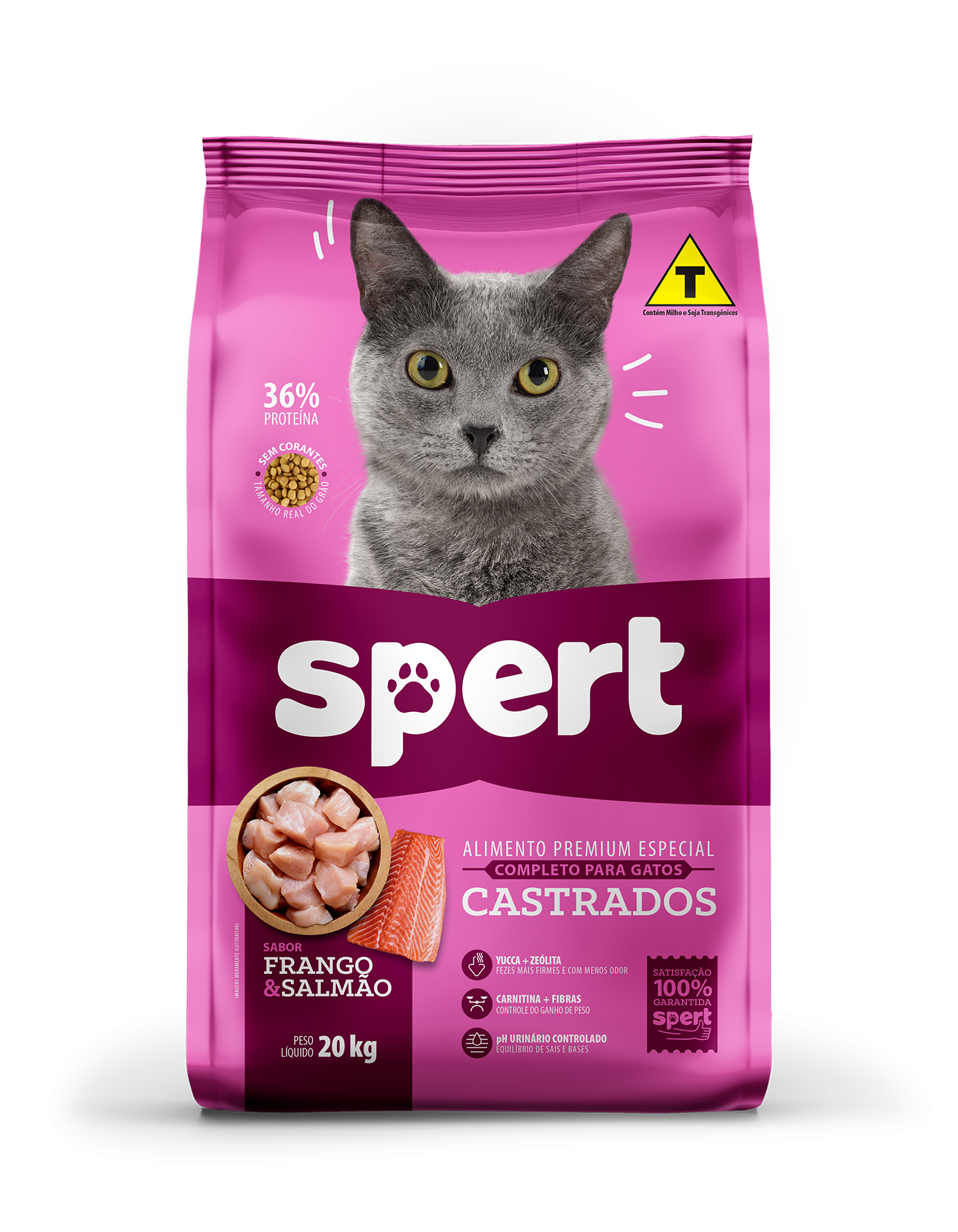 Ração Spert Gatos Castrados 10,1kg é um alimento premium especial inidcado para gatos adultos. Com sabor de frango e salmão, oferece 36% de proteína bruta, l-carnitina e fibras para controle de peso, além de taurina para saúde cardíaca e da visão. Sua fórmula auxilia na saúde urinária, reduz o odor das fezes e utiliza prebióticos.